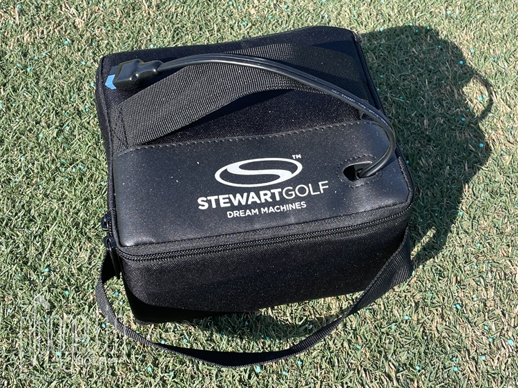 With both the main battery and handset, charged I was ready to get the Stewart Golf V10 Remote underway. Stewart states that the V10 Remote is “optimised for use with a cart or tour style bag weighting 31 lbs” so I grabbed my fully loaded Vessel Lux Cart [review HERE] bag. Placement was straightforward, but I had to give the bungees strong tugs to make it around my bag.