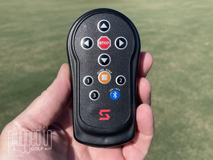 Operation of the Stewart Golf V10 Remote was very intuitive. It’s definitely worth reading the owner’s manual, but the buttons do exactly what you expect. Up arrow gets the V10 Remote moving forward and makes it speed up. The down arrow is for slowing down, or if stopped – reverse. And of course, left and right arrows are for left and right turns. I really liked the GLIDE STOP button to avoid the instant and occasionally jarring stop of the STOP button. The 1, 2, and 3 buttons are cruise control speeds – more on those later.