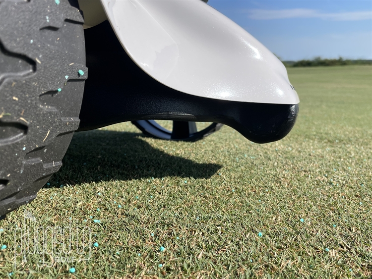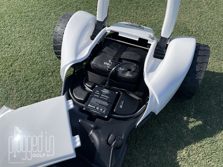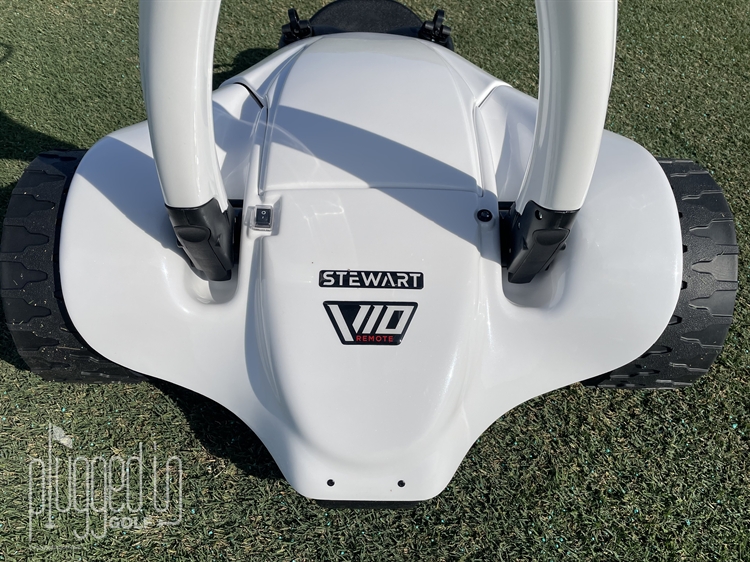 Before I get to the on-course performance, let me mention how easy the Stewart Golf V10 Remote is to transport. Stewart created a lifting point under the front bag support that you use in conjunction with the rear stabilizer to lift and carry the unit. With the V10 Remote weighing in at just under 38 pounds, having dedicated lift points is important. Also, the white, five-layer Senosan composite body panels are too flexible for lifting, which Stewart notes “could cause unintended damage that will not be covered under warranty.”