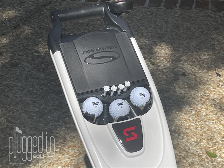 As for storage, the Stewart Golf V10 Remote has a scorecard compartment and built in holders for 3 golf balls and 4 tees. Interestingly, I tried a variety of wooden tees and none of them fit – just the plastic ones I had. Stewart designers kept things simple – there aren’t any accessories to add. And I’m ok with that. I prefer to utilize my bag like I’m carrying even when using an electric or push cart. Plus, I suspect accessories might impact how compactly the V10 Remote folds.