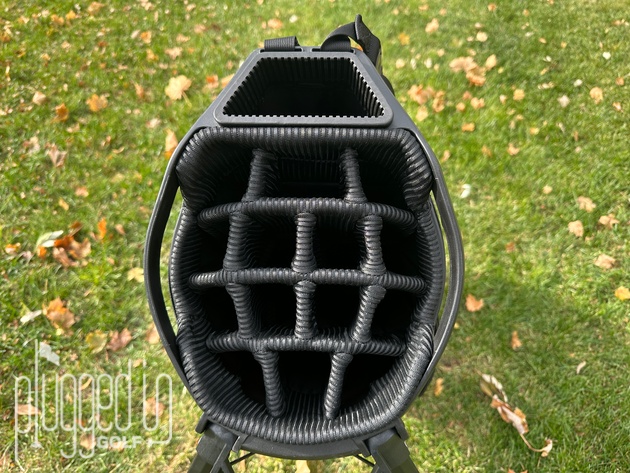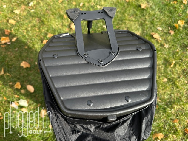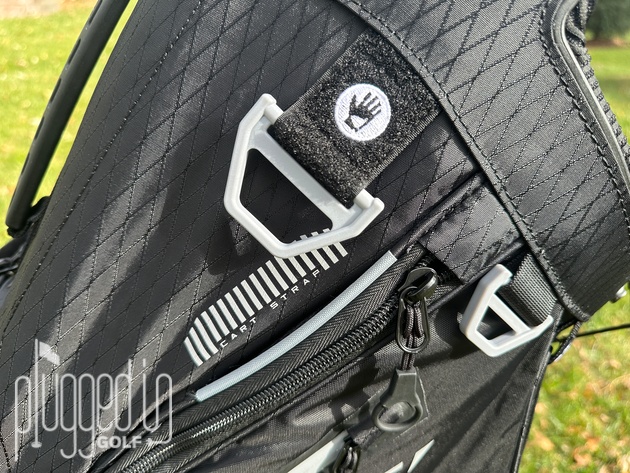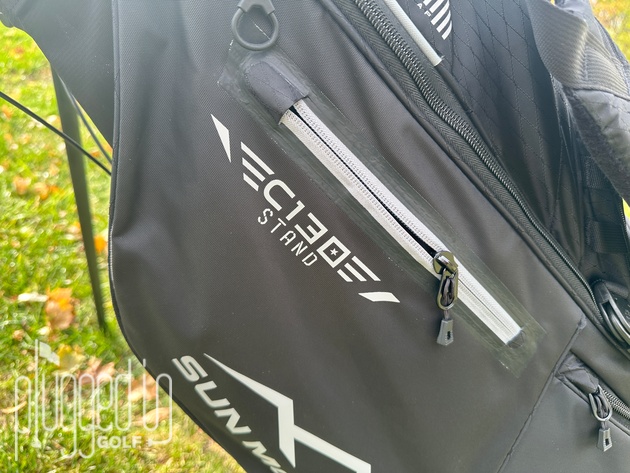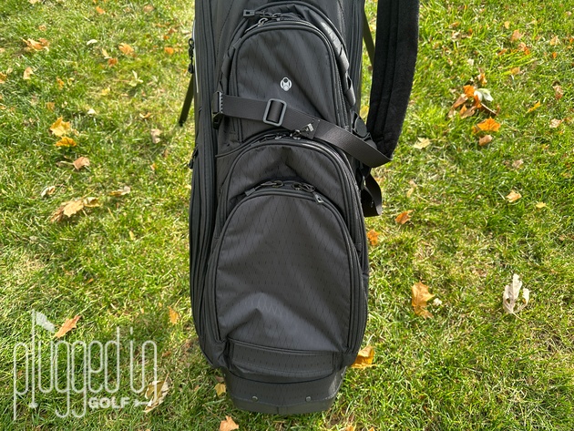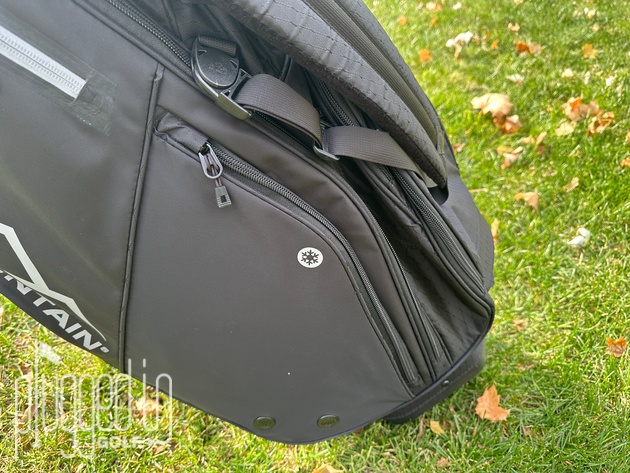 On the back of the bag, there are three separate zippered compartments. The top is velour-lined and labeled for your rangefinder. While many bags have a magnetic rangefinder pocket, the zippered pocket makes more sense here because the riding golfer isn’t putting their laser in the bag between shots. The ball pocket is cavernous, and the middle pocket is shallow enough to keep your “sometimes” gear accessible.