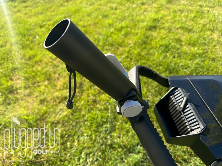 The Sun Mountain Ridgeline 3 push cart comes with an umbrella holder that screws into the center of the handle. You can set the angle to match your handle height, which is a nice feature. Sun Mountain also includes a cup holder which sits on one of the two accessory pegs. There is a wide variety of additional accessories from Sun Mountain that includes a cooler, rangefinder pouch, speaker, and several storage packs.