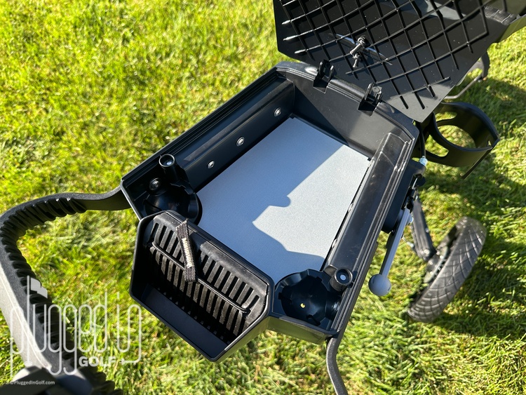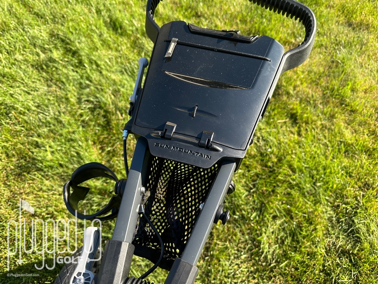 The Sun Mountain Ridgeline 3 has a large console where you can store anything you need to keep handy. On top of the storage compartment, there are elastic bands to hold a scorecard and a pencil. Below that, a net gives you the ability to stash a big water bottle or a rangefinder.