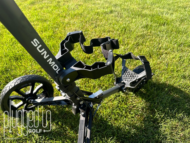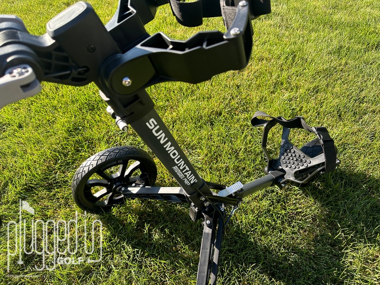 I thought I would start this section talking about the Vertical Fit Technology, but when I got it on the course, I knew I had to begin with the quality of the roll. The Sun Mountain Ridgeline 3 push cart features large “high impact wheels” and stainless steel bearings that roll smoother than any push cart I’ve used. The cart moves easily through rough, divots, and over elevation changes. It also has a very wide, stable stance, so I never had to worry about it toppling over.