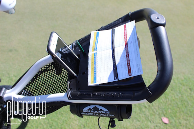 My favorite part of the GX is that it has a spot for everything.  The cell phone pocket holds the phone upright and facing the golfer with screen visibility.  Being able to check your phone quickly between shots without lifting a finger is a very convenient feature.