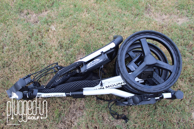 The Speed Cart GX is well designed, using two rotating latching brackets to fold the handle and front wheel into a compact and easy-to-load position.  When fully assembled, the wheels are wide enough for balance but can also fit through a doorway.