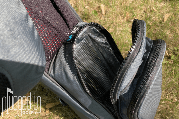 The Loma XL is equipped with backpack-style straps, which is nice if you want it. To me, the bag isn’t heavy enough to warrant them, and it’s easier to just use one. It also has a plastic handle that can be used to easily carry the bag short distances. While you aren’t going to be able to fit a rain suit or sweater in the pockets, there is ample storage for balls and tees. There’s a small velcro patch to conveniently store a glove, a clip for your rangefinder case, and a velour-lined valuables pocket. There’s also a “frosty beverage” pocket designed to keep a can cold. A large water bottle likely won’t fit.