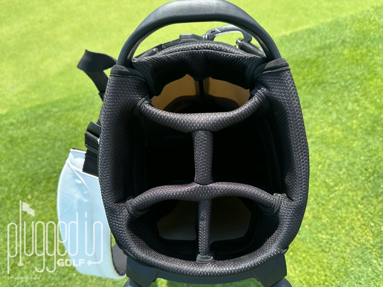Ryder’s 7.5″ 5-way top has full-length dividers for each compartment.  I loaded in fourteen clubs, all with midsized grips, and had no significant issues.  My preference would be for the top section to be larger, but that’s just because I like all my headcovers to be in that area.
