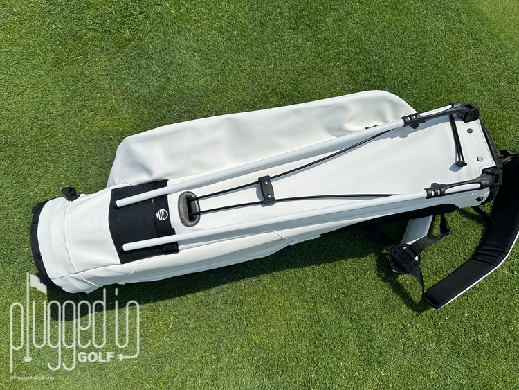 The Sunday Ryder S-Class golf bag has a sturdy stand mechanism that operates by tilting 2/3 of the base.  I strongly prefer this style of stand versus the “foot switch” for durability purposes.  Additionally, it gives the bag more stability when it’s tilted over.