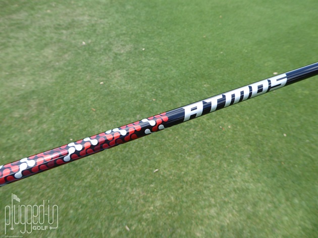 The face is a moderate height and the prominent white bottom groove frames the golf ball perfectly with proper setup. The black/silver/red of the head is echoed in the Fujikura Atmos Red shaft.