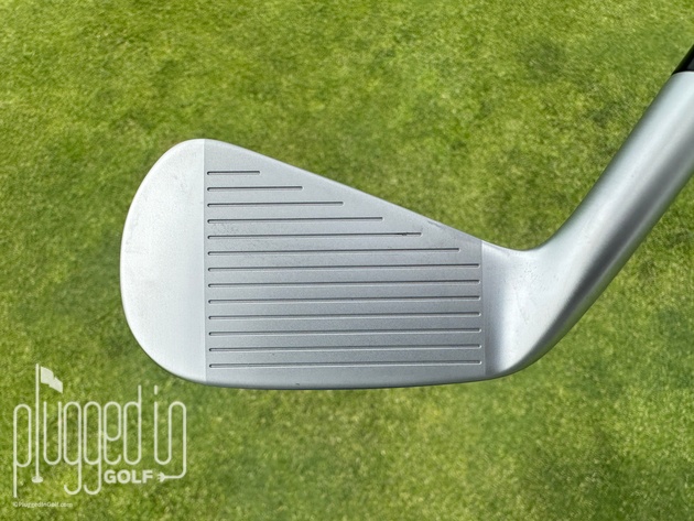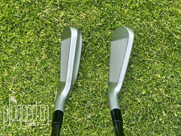 The TaylorMade P UDI and P DHY (above, left, review HERE), while clearly related, have some obvious differences at address. The P UDI has a thinner top line, and its face is about 1/8″ taller at its peak. Both irons are the same length from heel to toe, though the shorter face makes the DHY look longer. TaylorMade does not give offset specs, but to my eye there is slightly less offset in the P UDI.
