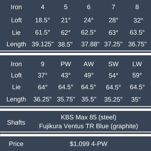 The TaylorMade Qi10 irons are extremely long. Strong draw bias in the long irons. Solid feel. Mid-low spin. Strong lofts.
