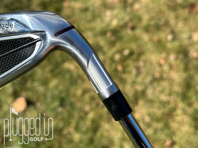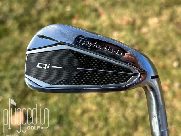 In the bag, the TaylorMade Qi irons have a very sleek look, centering a large carbon fiber piece inside a sliver of matte silver and a larger frame of chrome. The branding is minimal with a white “Qi” near the toe and a TaylorMade logo along the top. You may also notice that the 4-8 irons are distinct from the scoring clubs in that they have Speed Pockets on the sole and some material removed from their hosels.