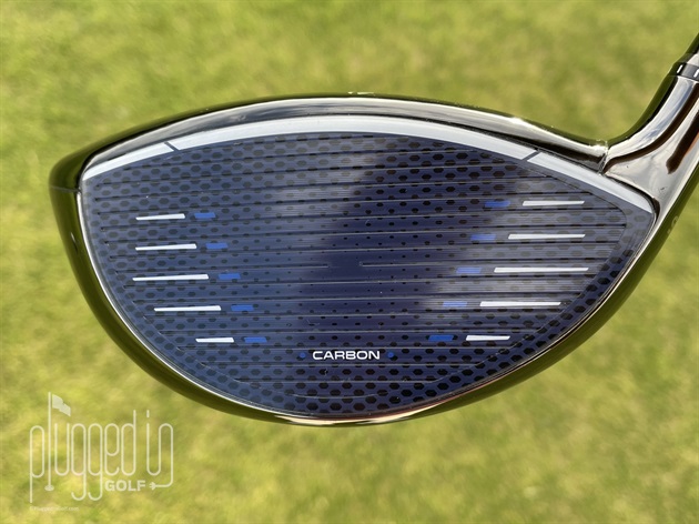 That grey top edge of the face is more readily apparent straight on.  TaylorMade did another great job at adding interest to the face with a restrained honeycomb pattern and pops of blue graphic grooves.