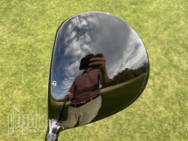 I really like the cleaner look of the Qi10 at address.  The new Infinity Carbon Crown, with its 97% coverage, looks elegant compared to the framework surround of the Stealth 2.   A subtle pinstripe adds some definition to the trailing edge, while the TaylorMade “T” serves as an alignment aid.  TaylorMade also made the top edge of the face visible and light grey to assist with alignment – a visual element that instantly helped me.  As my photo reveals, the deep gloss of the crown is reflective, but adds to the elegant accolade.