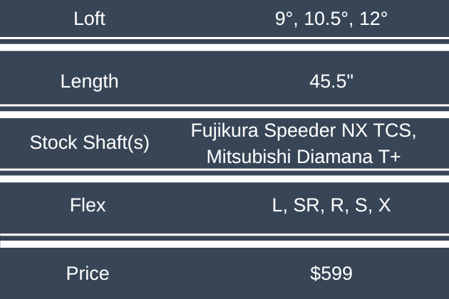 As usual, loft is easily adjusted via the adapter sleeve. There are no moveable weights to influence ball flight. Stock shafts include made-for versions of Fujikura Speeder NX and Mitsubishi Diamana. I tested it with the Diamana T+ and found it likely to be a serviceable shaft for a wide range of golfers.