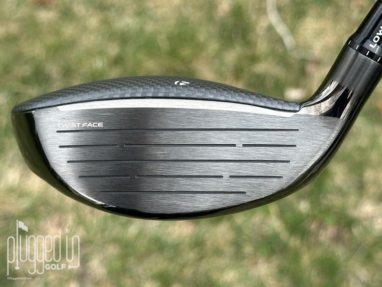 From the moment you set it down, you can see that the TaylorMade Qi35 fairway wood is a massive aesthetic departure from the Qi10 fairway wood [review HERE]. Where the Qi10 had a gloss black crown, the Qi35 fairway wood is covered in grey carbon fiber. The back edge has black stripes which give the shape a bit of definition. Overall, the Qi35 is of average size with a balanced (though not symmetrical) shape.