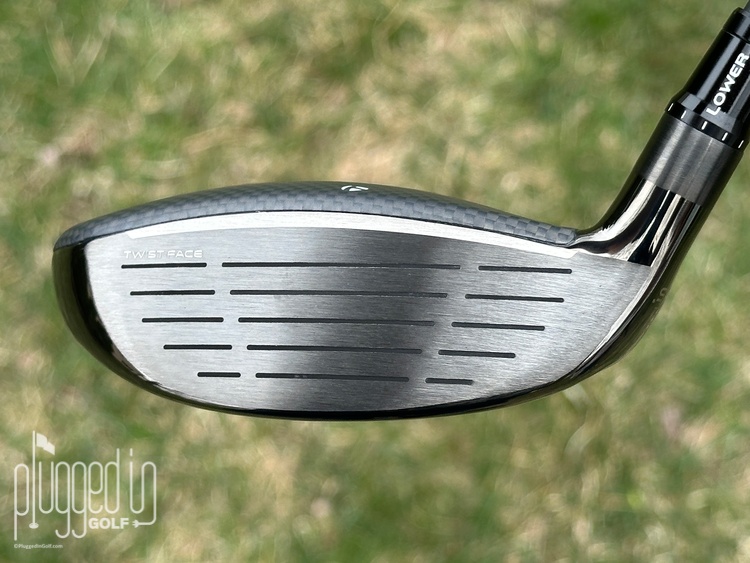 The biggest difference between the TaylorMade Qi35 Max fairway wood and its predecessor, the Qi10 Max fairway wood [review HERE], is the crown. Unlike the gloss black of the Qi10, the Qi35 Max has a matte grey carbon fiber crown. The classic “T” alignment aid is centered, but the face does sit slightly closed in the neutral setting.