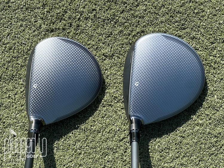 Comparing the Qi35 Max fairway wood to the Qi35 (above, left), the Qi35 Max is a bit larger from front to back and heel to toe. The Qi35 also has a slightly taller face. What stands out more than the dimensional differences is the contrast in shape. Where the Qi35 has a slimmer look, the footprint of the Qi35 Max is sprawling, fuller in heel and toe.