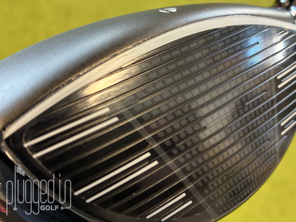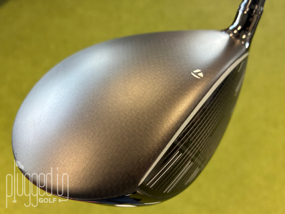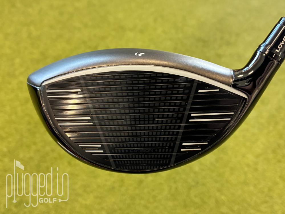 At address, the crown displays a uniform carbon fiber design in a matte black finish. The TaylorMade “T” logo sits along the leading edge and acts as the singular alignment aid.