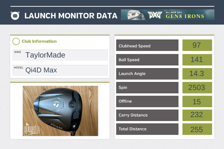The TaylorMade Qi4D Max driver is the company’s first Max model driver with adjustable weighting, and that proved to be a good thing for me during my testing. With the two interchangeable weights in their stock position (the heavier weight in the back) I had a tough time keeping the spin under 3000 RPM. When my fitter Adam moved the heavier weight forward, we immediately saw about a boost in carry distance of nearly 10 yards, on average.