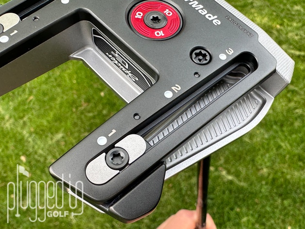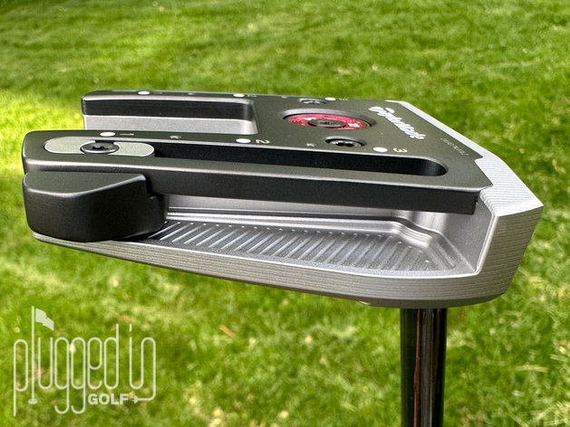 The big question about the TaylorMade Spider GT MAX putter is whether or not the 40 gram sliding weights do anything. Per TaylorMade, each of the three “main” positions comes with a unique benefit. Position 1 (weights back) helps players who miss left, Position 3 (weights forward) helps those who miss right, and Position 2 provides “versatility and performance similar to Spider X” [review HERE]. It should be noted that there are more options: you can put the weights anywhere along the track for “in between” positions, and the two weights can be positioned differently (toe weight up, heel weight back, for example).