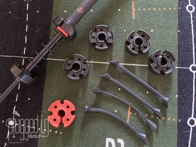 The ONE system includes the club itself (with shaft, grip, sliding carriage, and dampening end stopper), weights (4 @ 60 gram, 1 @ 125 gram), and elastics (1 weak, 2 medium, 1 strong).  Installing both weights and elastics is both simple and intuitive.