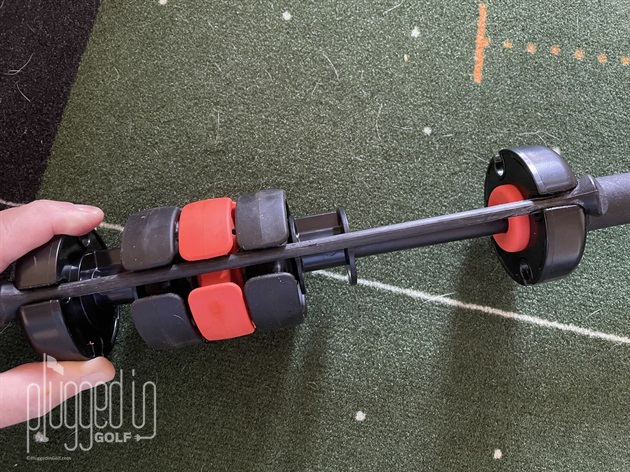 With a few swings of the ONE in a base level 1 setup, I had a good understanding of both Feel and Release.  As you swing, the carriage slides and creates a “click” as it hits the end stopper.  The key to training is to find a level – a combination of weights and elastics – that allows you to achieve a repeatable, good, release point three times in a row.  I found that level 3 with three weights was a good starting point and began three sets of 3 swings, 3x a week – both directions.  Swinging left handed was awkward and not always pretty, but based on the training videos it seemed wise to train both my dominant and non-dominant sides equally.