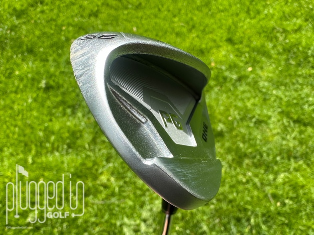 At address, The ONE Wedge has several distinguishing features. The face is very large and completely covered in grooves. Between the grooves are lines at 45 degree angles centering on a small vertical groove on the bottom of the face. That vertical groove is centered on the bottom groove but is heel-biased if you’re looking at the entire club. Shifting your eyes up, you’ll notice that the top line is not uniform – it’s much thicker on the toe side. Finally, the hosel has a PING EYE2 look to it – long, tapered, and giving the appearance of onset (the opposite of offset).