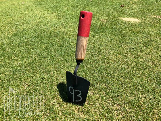 You can also leave your rangefinder in your bag. The shovel tee markers – which are awesome – have the yardage to the flag written in chalk.