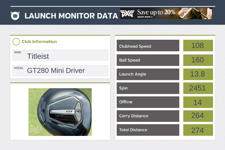 A premium strike with the Titleist GT280 mini driver produces a staccato, mid-pitch, metallic “snap.” The sound is too big to be a “tink” but too concise to be a “crack.” This pairs with a feeling that is quick yet powerful.