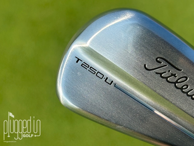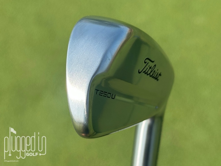 In the bag, the Titleist T250U utility iron is arguably even cleaner looking than the T150 or T100 [review HERE]. At a glance, the hollow body design is a convincing faux blade. The branding is identical to the other 2025 T Series irons with “Titleist” centered on the head and the model number tucked in near the toe.