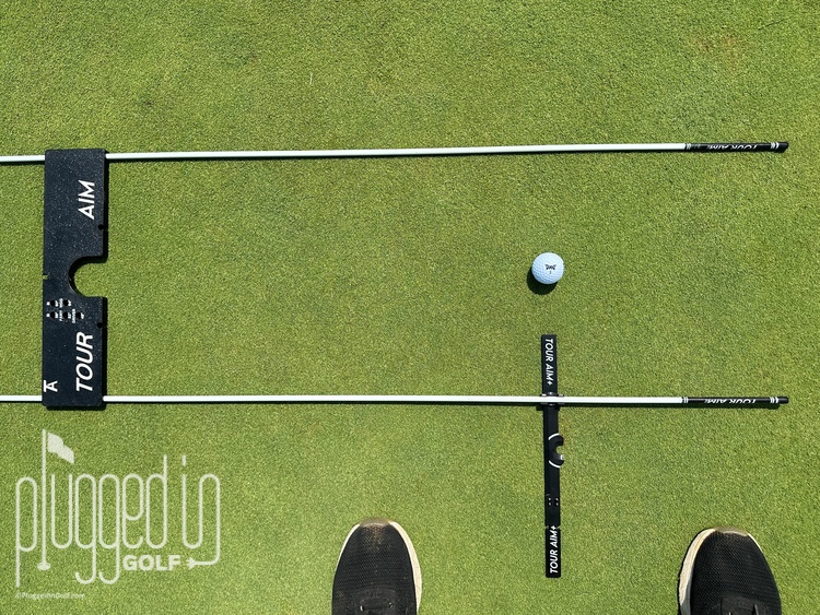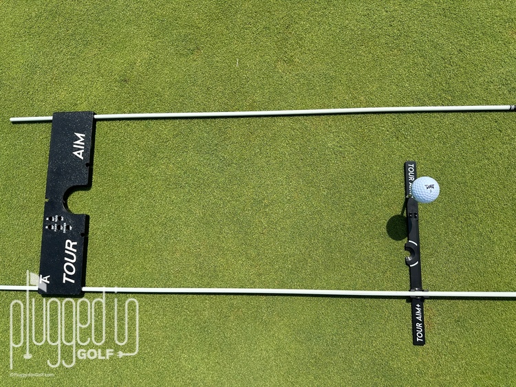 The third function relates to the Tour Aim’s putting drill. The Tour Aim+ holds the alignment sticks in perfect parallel while giving you a place to start your ball. It also gives you a reference for squaring the putter face.