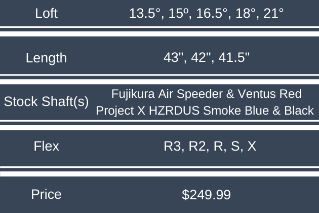 Though the Exotics line is no longer only for those in the know, their clubs, like the C721 fairway, continue to perform at a high level. I tested the C721 with the HZRDUS Smoke Blue RDX, and as you can see in the chart below, Tour Edge has other great shaft options as well as loft choices. With its consistent performance and wonderful sound, you’re going to want to try the Exotics C721 fairway for yourself.