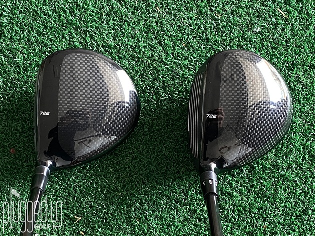 The differences between the Tour Edge Exotics E722 and C722 fairway woods are not as dramatic as between the two hybrids, but there are meaningful distinctions. First, the E722 (left) sits square to a hair closed, the C722 is square to slightly open. It’s a small difference, but face angle is a big deal to many golfers. Second, the C722 is shorter from front to back which gives it a more rounded shape overall. Finally, the face of the C722 is about 1/8″ taller than the E722 and it has more traditional score lines from heel to toe. The E722 has score lines surrounding a diamond graphic in the middle of the face.