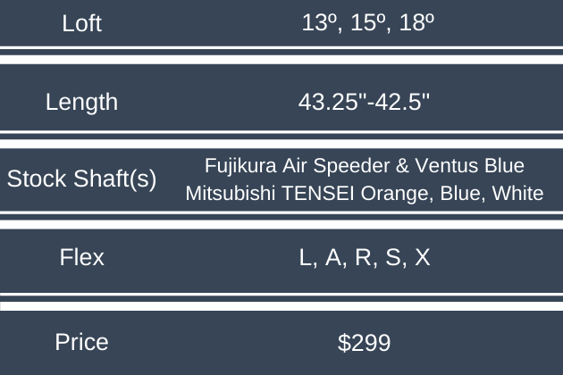 The Tour Edge Exotics C722 fairway wood comes with a huge array of shaft choices at no up charge. For players seeking something ultra-light, there’s the Fujikura Air Speeder at under 50 grams. Fujikura also offers the Ventus Red and Ventus Blue. Mitsubishi has a trio of TENSEI shafts – Orange, Blue, and White – in the 65 and 75 gram weight classes. Tour Edge Exotics offers their Speed Tested recommendations to help players pick a shaft if they can’t go for an in-person fitting.