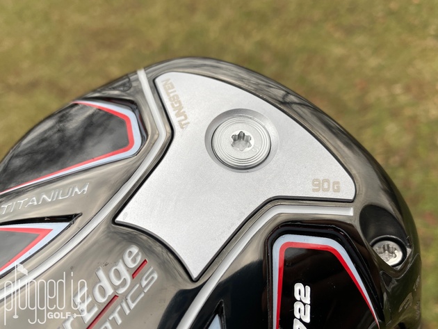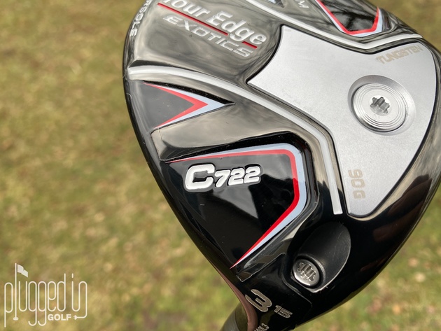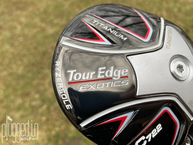 Flipping the club over, my eye was drawn to the 90 gram tungsten plate in the sole. This is the dominant element visually, and it pushes the Tour Edge Exotics and C722 branding to the periphery. The sole has a lot going on, but the design is cohesive.