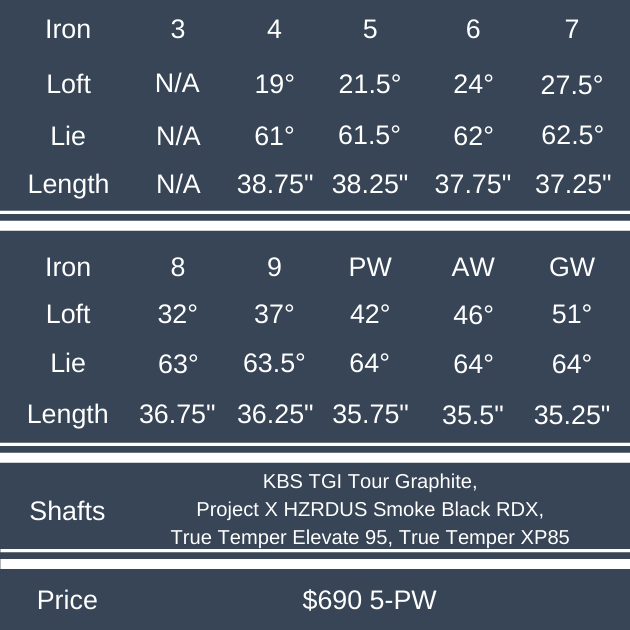 The above average launch and spin help to negate some of the typical concerns about strong lofted irons, but players should still be aware of their distance gaps and set make up. For me, the 21.5 degree 5I was the lowest-lofted iron I could consider carrying, and even that was borderline. When well hit, it went a mile, but, as a low launching player, I hit a fair number of shots that weren’t much longer than the 6I. Make sure to work with your fitter to create a proper set configuration for your game.