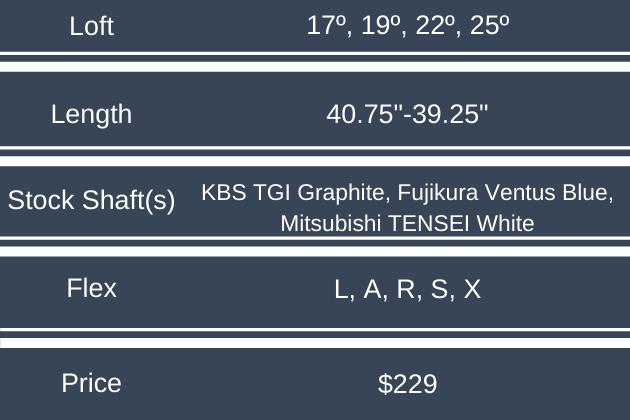 Tour Edge Exotics continues to be among the industry leaders when it comes to shaft choice and helping players pick the right shaft. The E722 hybrid is offered with the KBS TGI Tour Graphite and the Fujikura Ventus Blue in four and three different weights, respectively. Players who want a heavier shaft can opt of the Mitsubishi TENSEI White. Golfers can use TEE’s SpeedTested recommendations to choose the best shaft based on their swing speed.