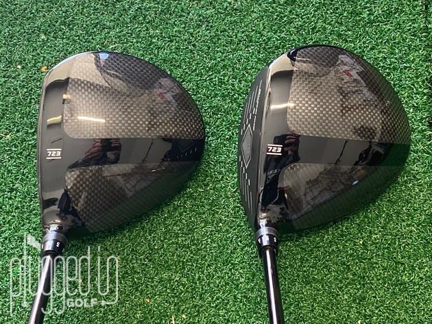 The E723 (right) and C723 drivers are as close in shape and size as any clubs in the 723 line. A close look does reveal that the E723 is larger – roughly 1/8″ longer from both front-to-back and heel-to-toe. This gives the E723 a slightly more stretched, triangular shape.