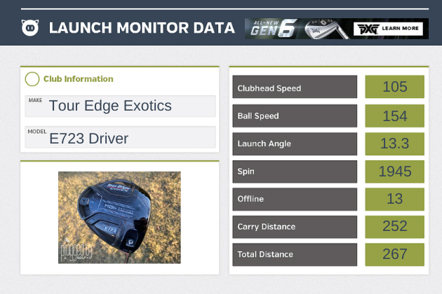 The Tour Edge Exotics E723 driver is one of the louder drivers I’ve tested this year. It has a sharp, mid-pitch “crack” with some pealing metallic highs. As you get away from the center of the face, the sound gets quieter and duller, providing very strong feedback on strike quality.