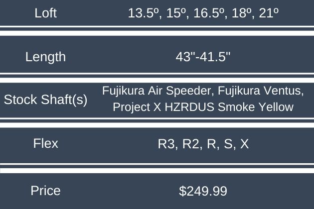 Finally, Tour Edge has done something noteworthy with their stock shaft offerings. Rather than offering the same shaft in every flex, they tested each head and shaft combination at different swing speeds to find the optimal pairings. Their SpeedTested data led them to offer three different stock shafts: Project X HZRDUS Smoke Yellow in Stiff and X for 95 MPH and above, Fujikura Ventus 4T Core in Regular and Stiff for 85-95MPH, and Fujikura Air Speeder in Ladies, A-Flex, and Regular for 85 MPH and below.