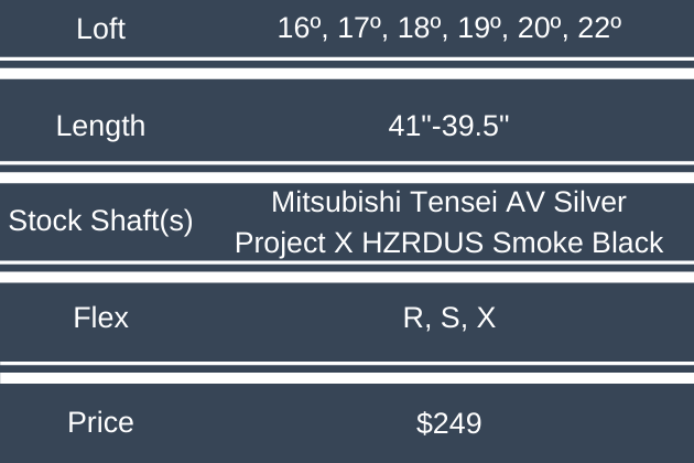 Tour Edge Exotics gives players two stock shaft options in the EXS Pro hybrid. The Mitsubishi TENSEI AV Silver is offered at 69, 77, and 82 grams, depending on flex. This option will give players slightly higher launch and spin than the Project X HZRDUS Smoke Black. In addition to being lower launching and spinning, the HZRDUS is heavier: 85 grams. Both shafts are available in regular, stiff, and X-flex.