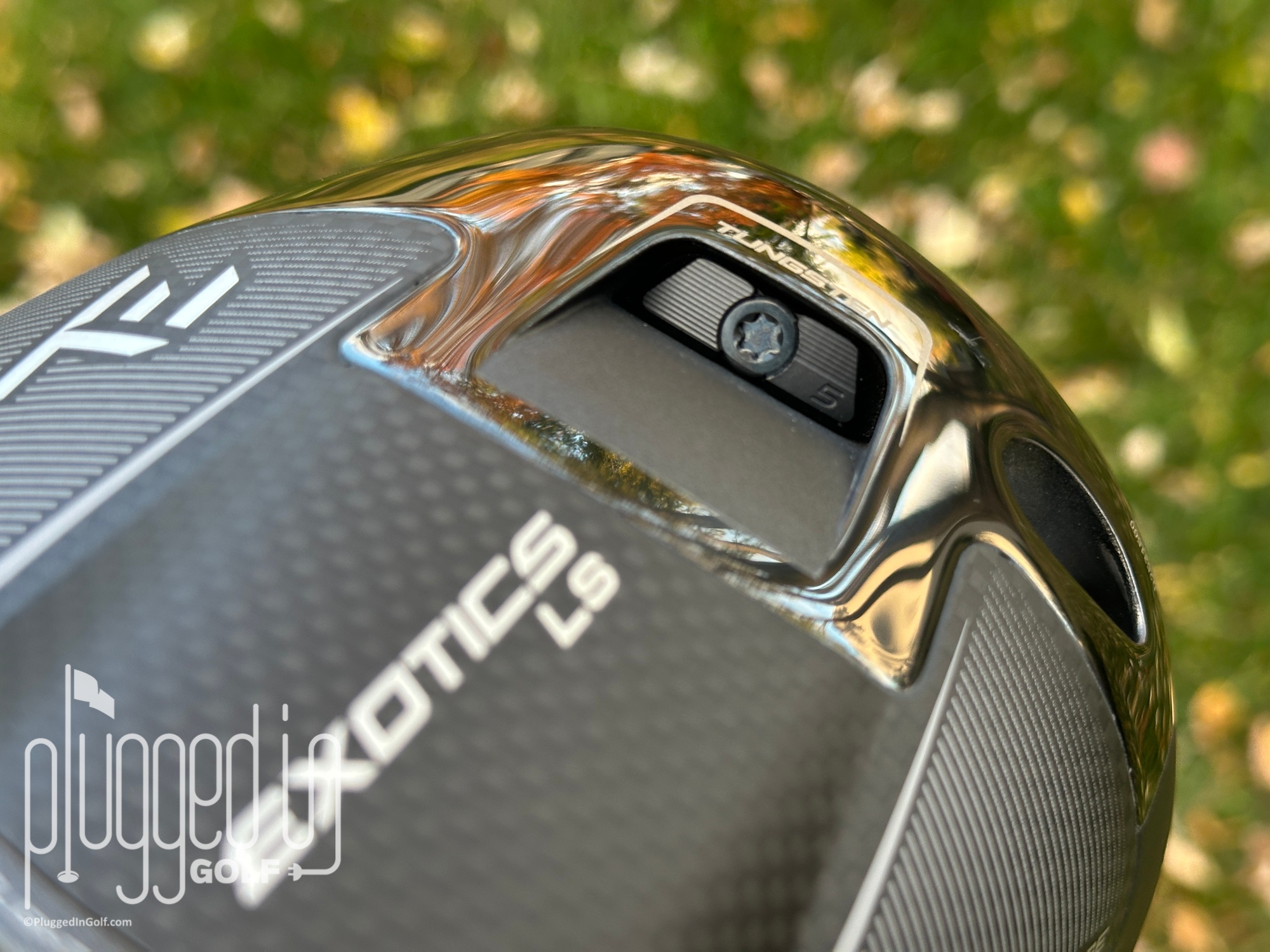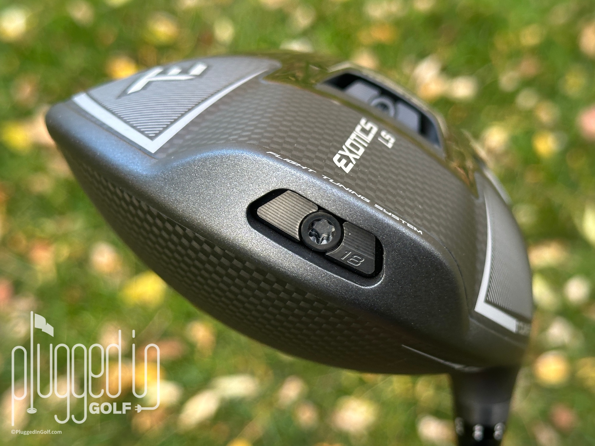 The biggest change from the C725 driver [review HERE] to the new Exotics LS is the adjustable weighting. With the C725, there were two weights – one for the front port and one for the rear track. This allowed golfers to modify the spin and bias the shot shape. The new Tour Edge Exotics LS driver ditches the back weight track, opting for a simpler front/back scheme with weights of 5 and 18 grams. Per Tour Edge, moving the weight can change the spin by as much as 300 RPM and the MOI by 11%. Both drivers have the same adjustable hosel for manipulating loft, lie, and face angle.