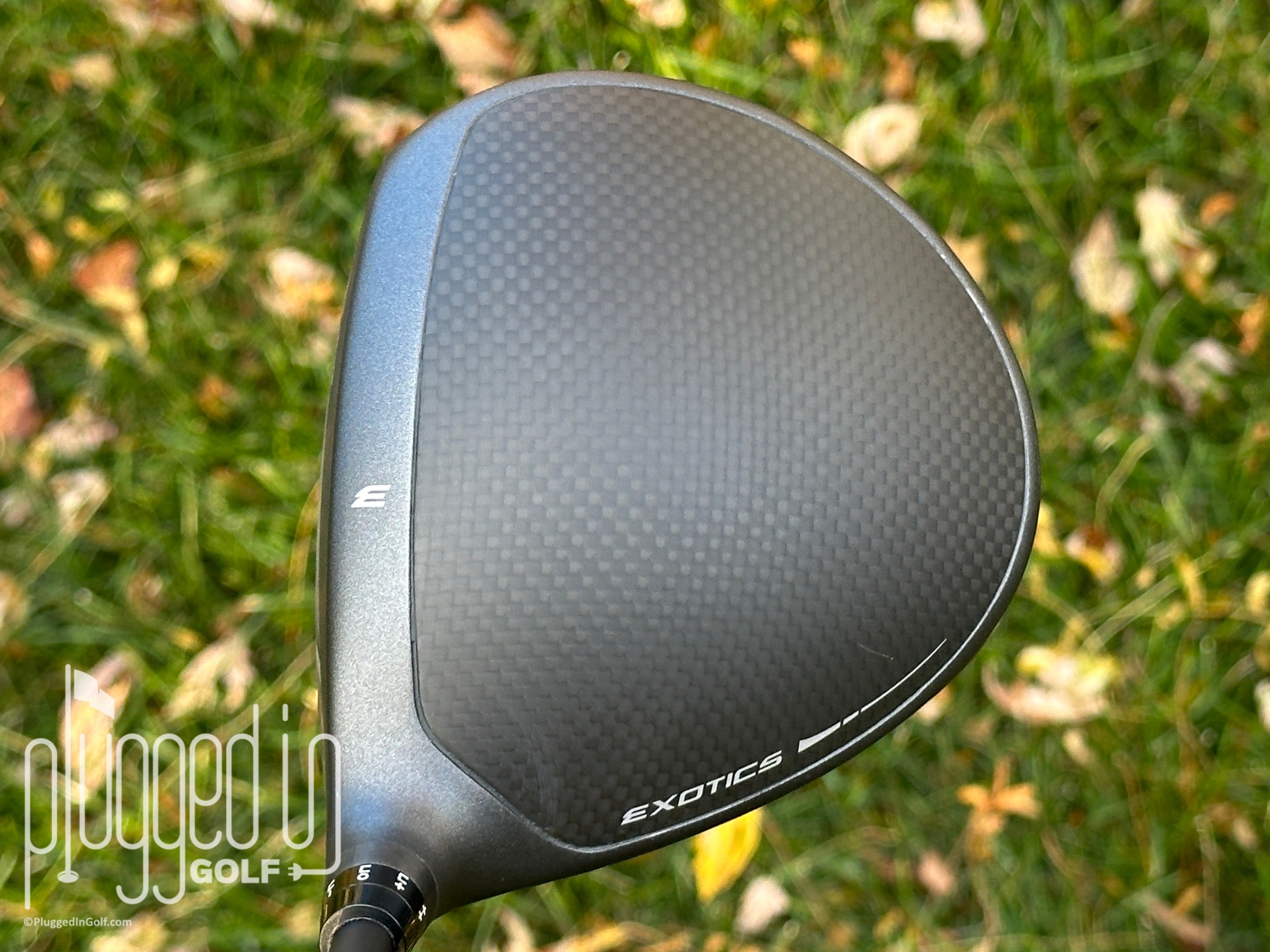 Putting the Exotics LS driver side by side with the Tour Edge Exotics Max driver emphasizes how short it is from front to back – roughly 1/4″ shorter than the Max. Leaving aside size, both drivers have a lot in common. Both have a glare-busting matte crown and a small “E” alignment aid.