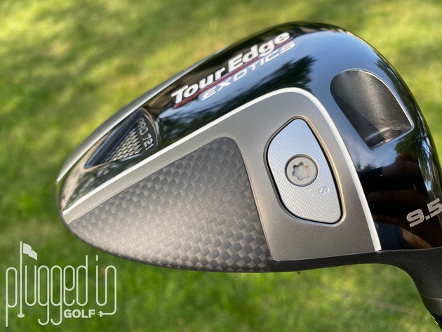 The look of the Tour Edge Exotics Pro 721 driver – both at address and in the bag – is very similar to the Pro 721 fairway wood [review HERE]. In the playing position, you’ll see a matte black crown with two large “wings” of carbon fiber. The head is compact, particularly from front to back, round, and it sits square in the neutral setting. To my eye, this driver is a prime example of being interesting without being distracting.