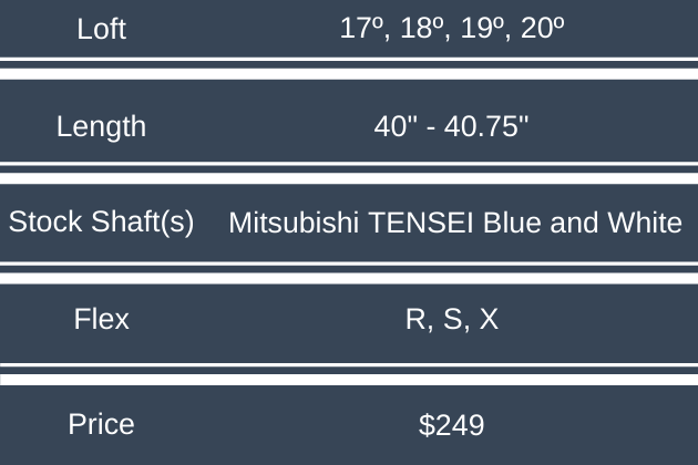 As with the other Pro 721 clubs, Tour Edge Exotics offers multiple Mitsubishi TENSEI shafts as stock options. In the hybrid, you can choose between the TENSEI Blue and the TENSEI White. The TENSEI White is heavier – approximately 90 grams vs. 80 – and promotes a lower trajectory.