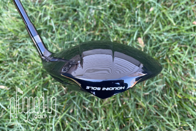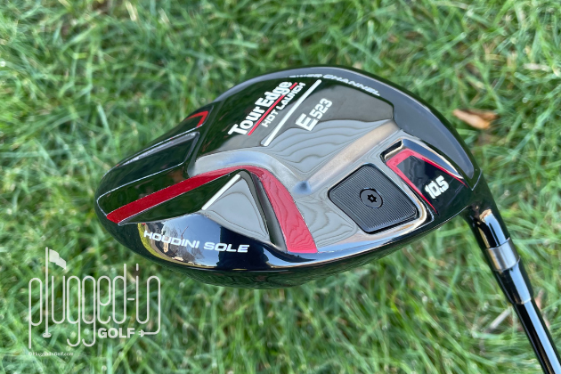 The Tour Edge Hot Launch C523 and E523 are noticeably different in the looks category. Although both have glossy crowns with a “523” alignment aid on top, the E523 (above) is more round in shape with a wide face and larger footprint. The E523 also sits lower to the ground and sports an elevated ridge to aid with alignment. A single adjustable weight sits on the heel side of the sole, while engineers placed an additional pyramid shaped mass called the “Houdini Sole” in the rear of the club for increased stability.