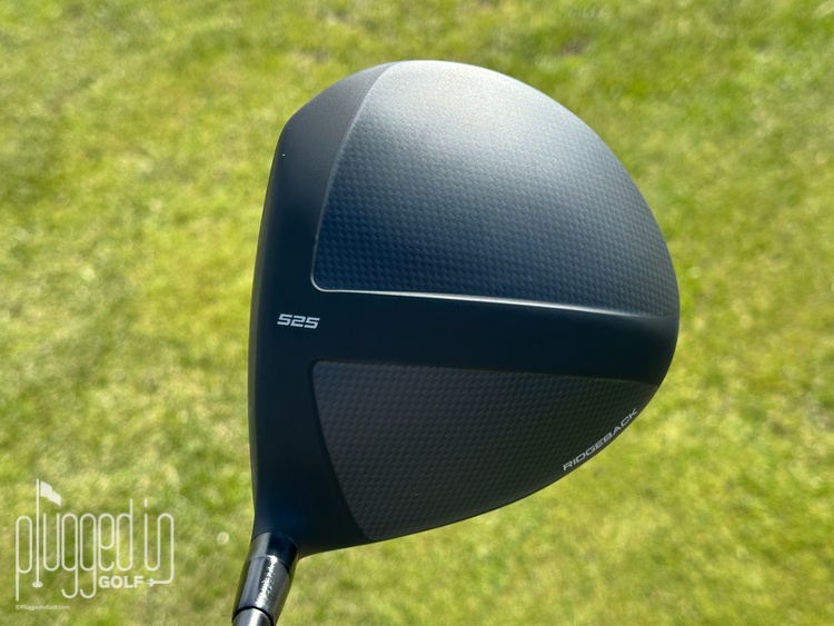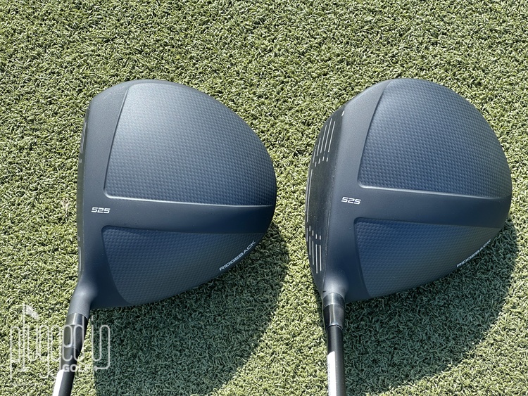 The two new Tour Edge Hot Launch 525 drivers share some key visual hallmarks. Both clubs sport a matte black carbon fiber crown that’s bisected by the ridgeback rail. They also share a long, stretched shape, though the E525 is closer to symmetrical, the X525 has a clear lean toward the heel.