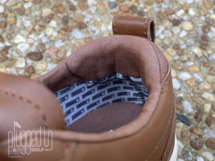 I slipped on the TRUE Linkswear FS-TOUR sans socks to gain a sense of the comfort inside the shoes and was impressed. My feet didn’t sense a single seam or stitch. The insole, what TRUE calls WANDERLUX Ultra Plush, was supportive – not too firm and not too soft. The leather wrapped cushioning around my ankle was also very comfortable.